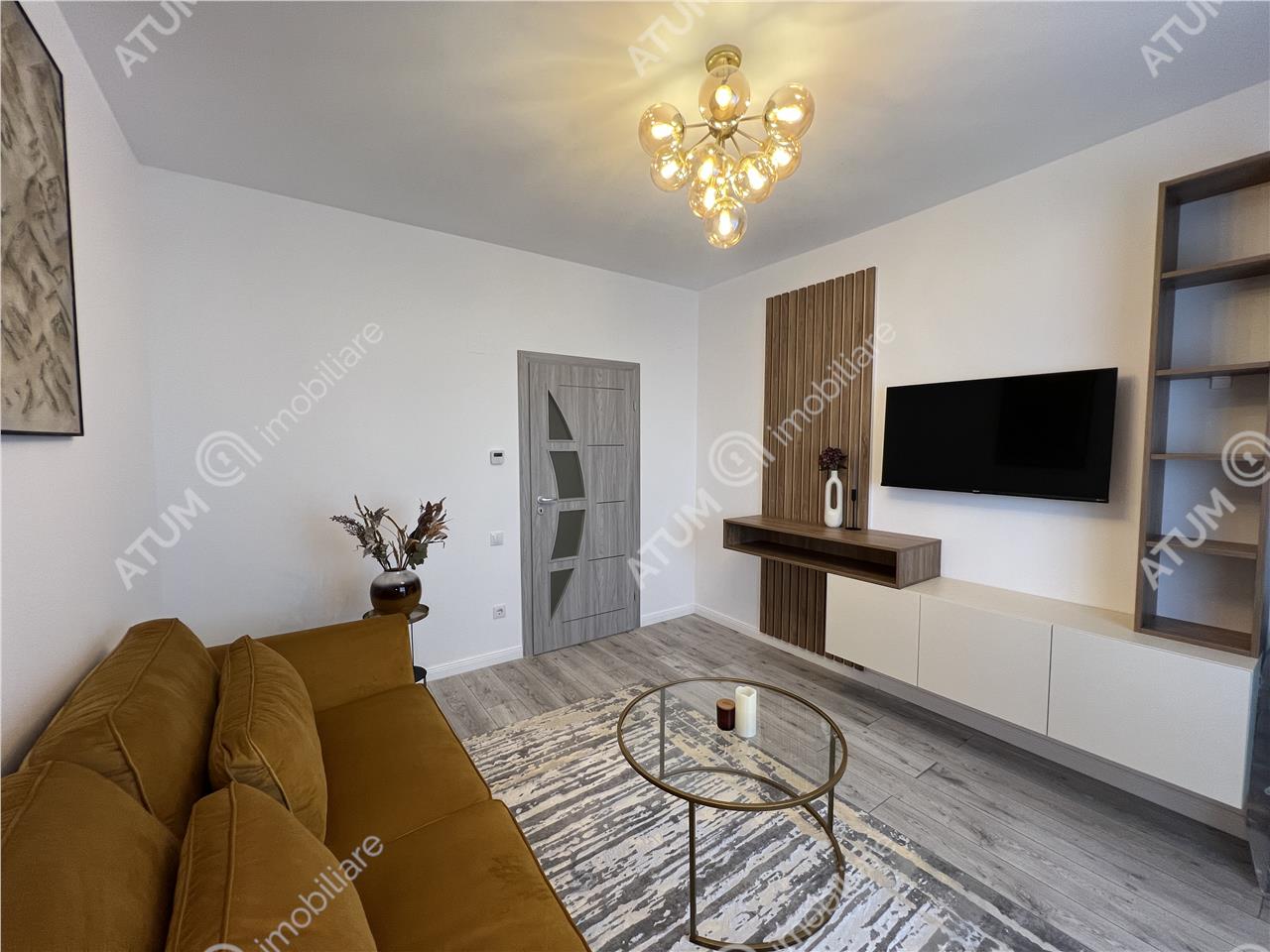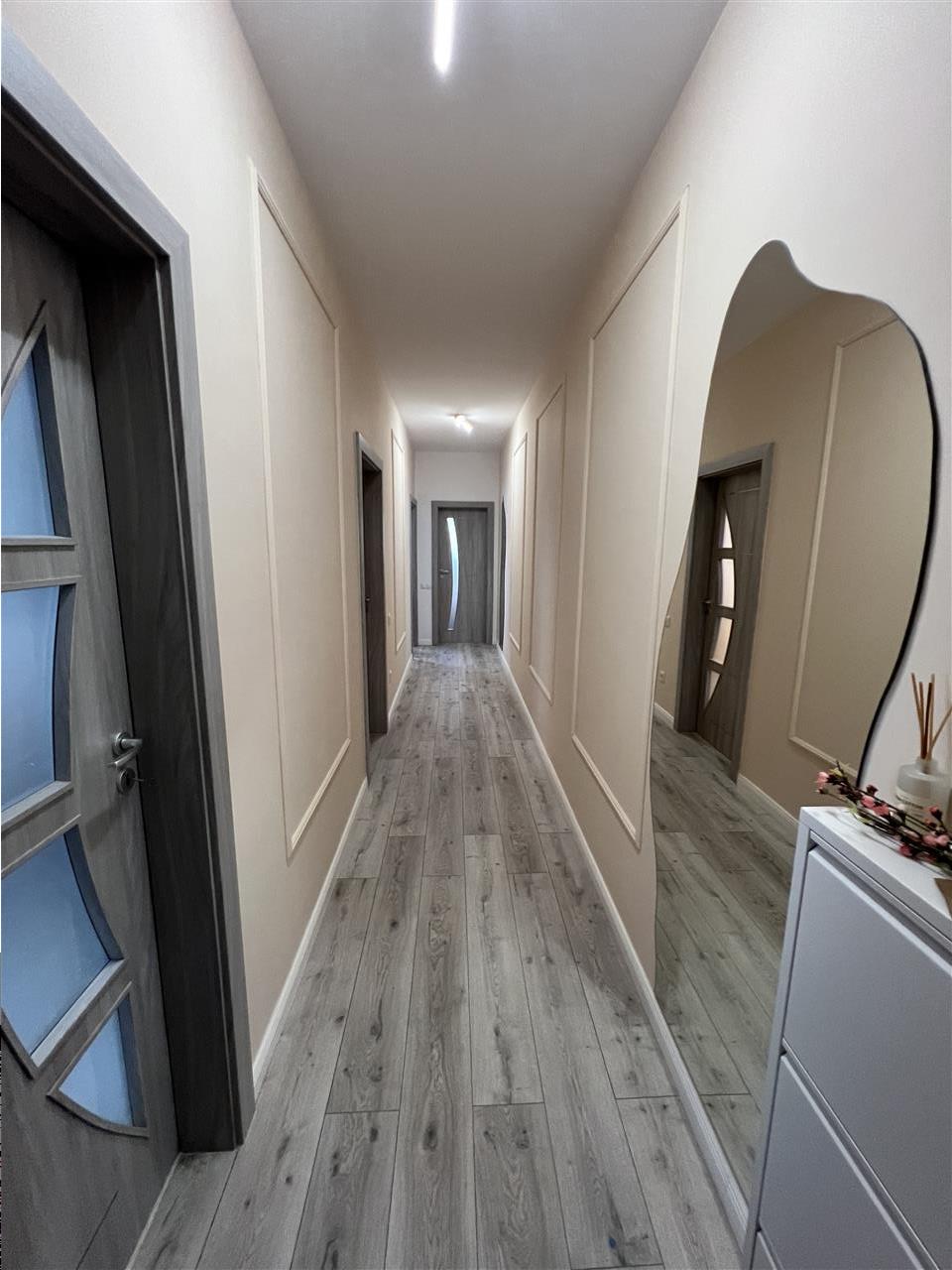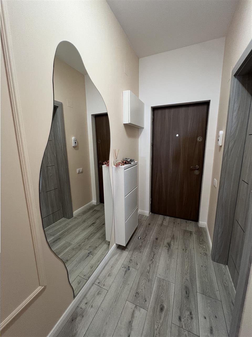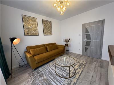 Apartamentul se preda complet mobilat si utilat cu mobilier de bucatarie realizat pe comanda din MDF cu electrocasnice incastrate (plita electrica, cuptor electric, hota, masina de spalat vase) cat si un spatiu destinat depozitarii bauturilor, mabilier de living care include canapea si corpuri ornamentale suspendate cu spatii de depozitare si masuta de cafea din sticla, mobilier de dormitor specific cu un dressing incapator, si baia amenajata ca atare.