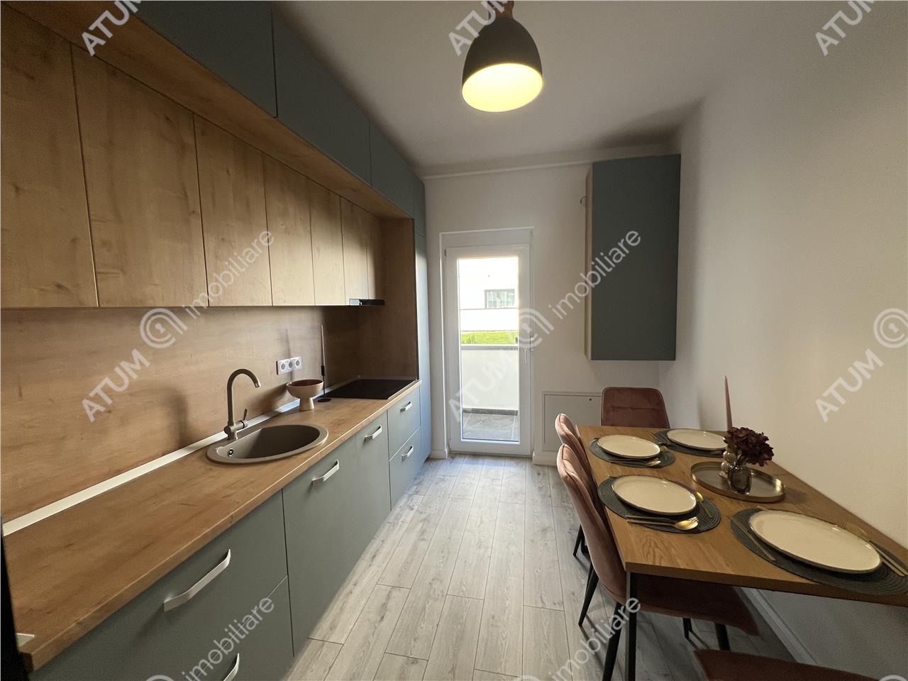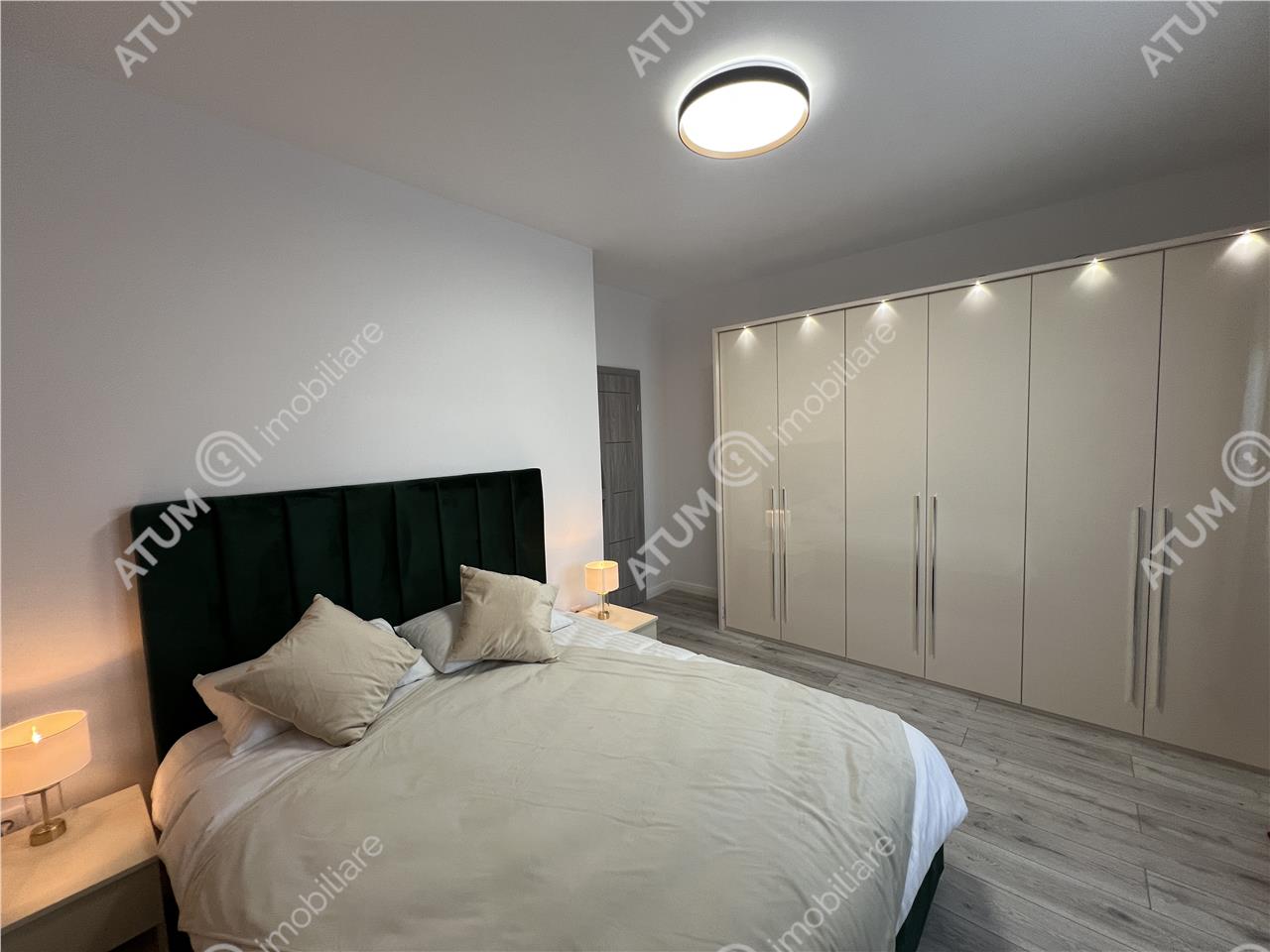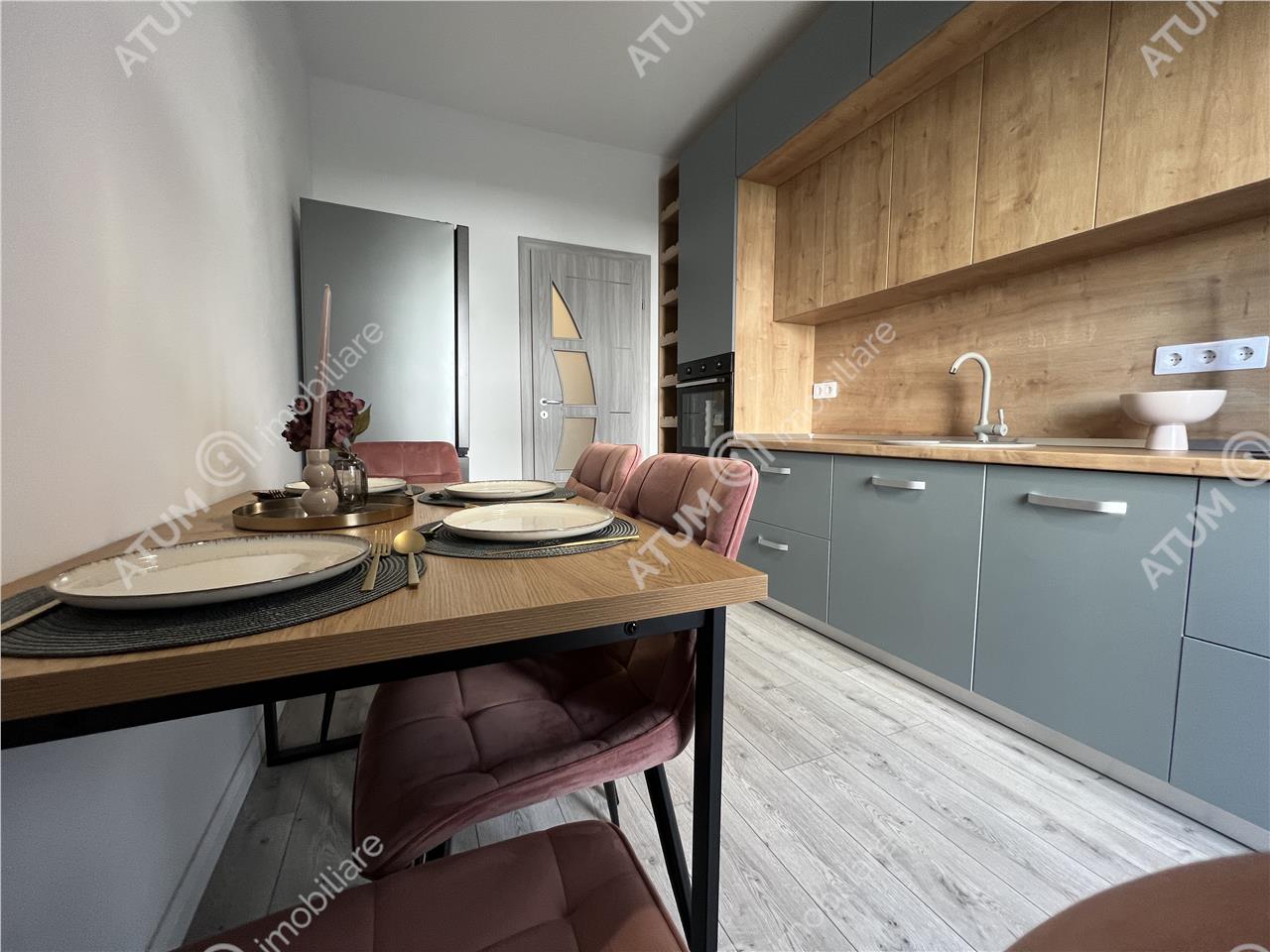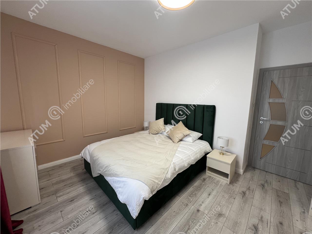 Apartamentul se preda complet mobilat si utilat cu mobilier de bucatarie realizat pe comanda din MDF cu electrocasnice incastrate (plita electrica, cuptor electric, hota, masina de spalat vase) cat si un spatiu destinat depozitarii bauturilor, mabilier de living care include canapea si corpuri ornamentale suspendate cu spatii de depozitare si masuta de cafea din sticla, mobilier de dormitor specific cu un dressing incapator, si baia amenajata ca atare.