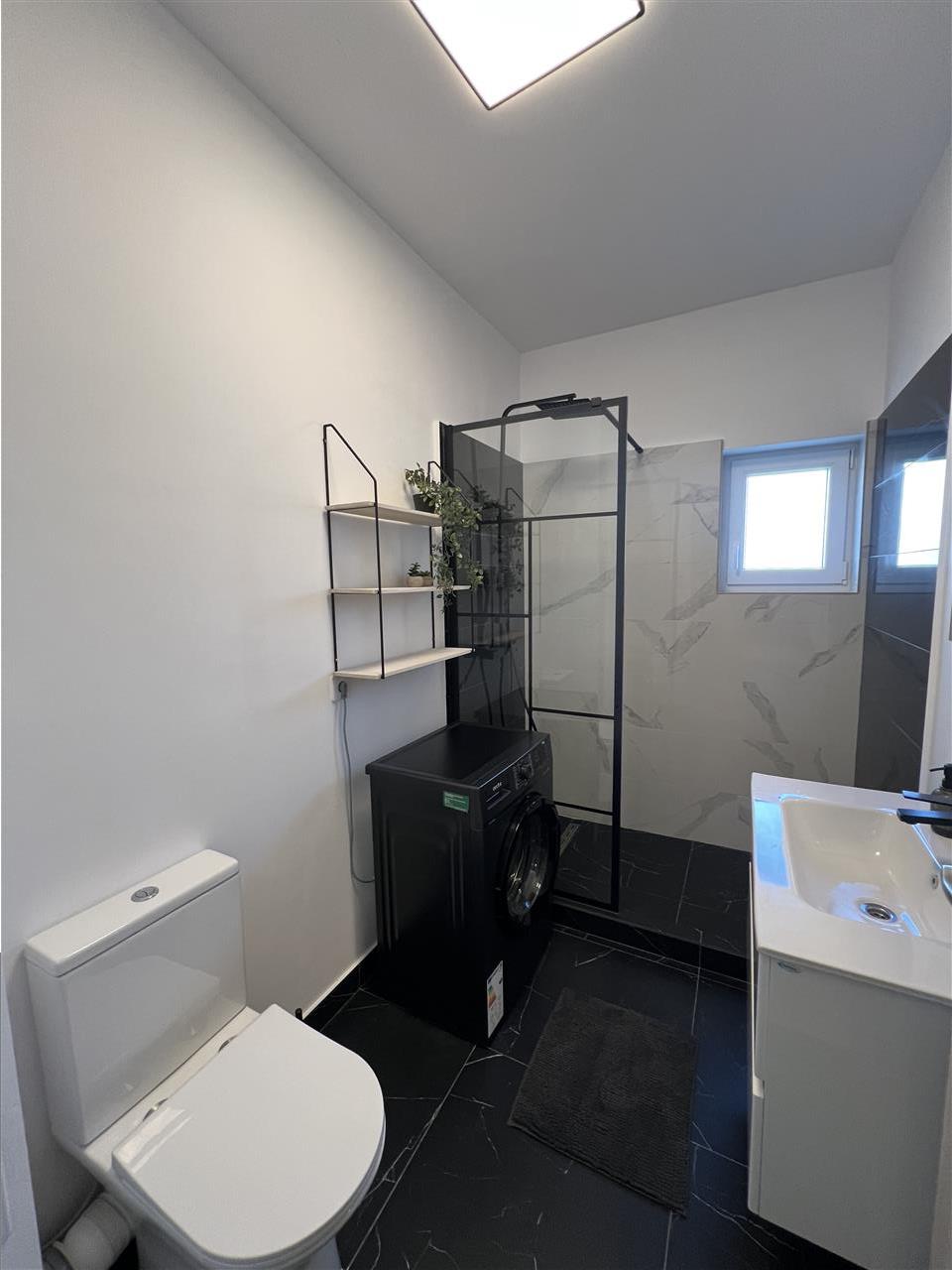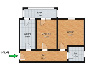 Apartamentul are 52 mp utili, la intrarea in locuinta regasim un hol generos de 9.30 mp din care accesul se face in toate incaperile, camera de zi 12.70 mp, dormitorul de 15.20 mp, bucataria separata de 9.90 mp si baia de 4.70 mp dotata cu cabina de dus cu rigola si geam pentru aerisire.
