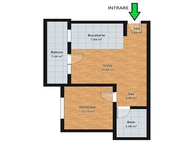 Suprafata utila a locuintei este de 47 mp si este compartimentata dupa cum urmeaza: living 17 mp, dormitor 12.23 mp, bucatarie 7.89 mp, baie 5 mp, hol 4 mp si un sas de intrare de 1.45 mp.