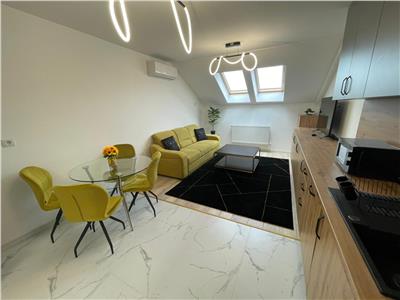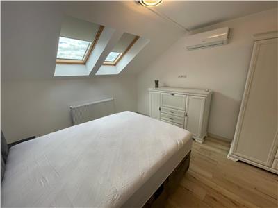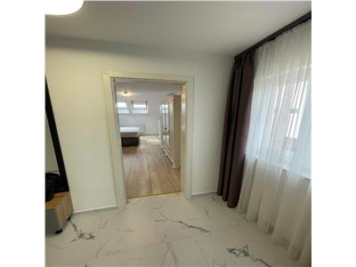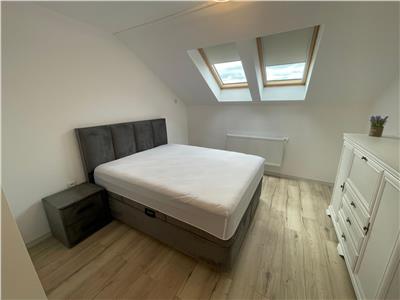 Apartamentul este la prima inchiriere si are dotari noi si de caliate, precu: usa de acces din metal, usi interioare din MDF, centrala termica proprie, termostat, tamplarie VELUX cu geam termopan, pardoseli placate cu gresie de 120/60, panglici de iluminat, instalatie AC, cuier si pantofar, cabina de dus si parchet laminat.