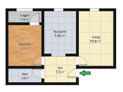 Locuinta in suprafata de 50,50 mp utili, dispune de o compartimentare practica si face din acest apartamnet o locuinta luminoasa si aerisita. Apartamentul este compus din camera de zi 17,4 mp, dormitorul de 11.00 mp cu acces in balconul tip logie inchis in tamplarie PVC cu geam termopan, unde se afla si un spatiu destinat depozitarii, bucataria separata de 7,62 mp, baia de 3,92 mp, dotata cu cabina de dus si holul generos de 7,50 mp, care este dotat cu zona de primire amenajata cu pantofar si cuier si un spatiu de depozitare in care este amplasata masina de spalat rufe.