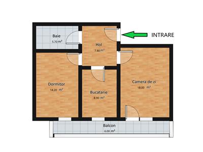 Suprafata utila a apartamentului este de 54.80 mp, acesta fiind compus din camera de zi 18.00 mp, dormitorul de 14.20 mp, bucataria separata de 8.90 mp, baia 5.70 mp dotata cu dus cu rigola si un hol spatios de 7.80 mp unde se afla si cuierul cu pantofar.