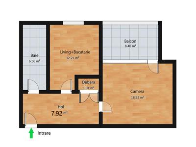 Suprafata utila a apartamentului este de 48 mp, acesta fiind compus la intrare dintr-un hol generos unde se poate pozitiona cuierul cu pantofar si unde se afla si un dressing incastrat, camera de zi tip open space cu bucataria, un dormitor generos, baia spatioasa dotata cu cada si geam de aerisire.
