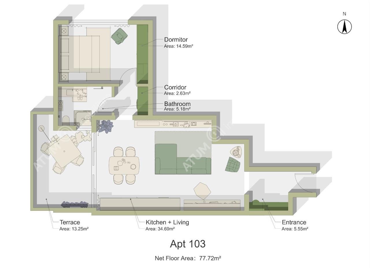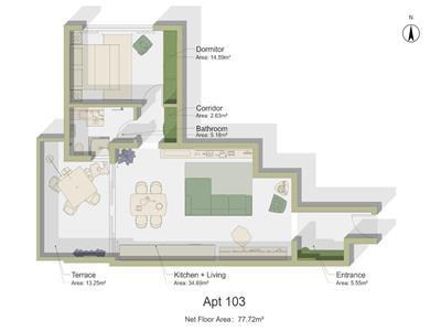 Locuinta dispune de 62.70 mp utili, compartimentati eficient si practic. Este formata din doua holuri: primul hol de intrare, unde se poate amenaja un cuier si pantofar si din care se acceseaza livingul open-space cu bucatarie ( 43.78 mp ), iar al doilea hol ofera acces catre baie ( 5.60 mp ) si dormitor ( 15 mp).