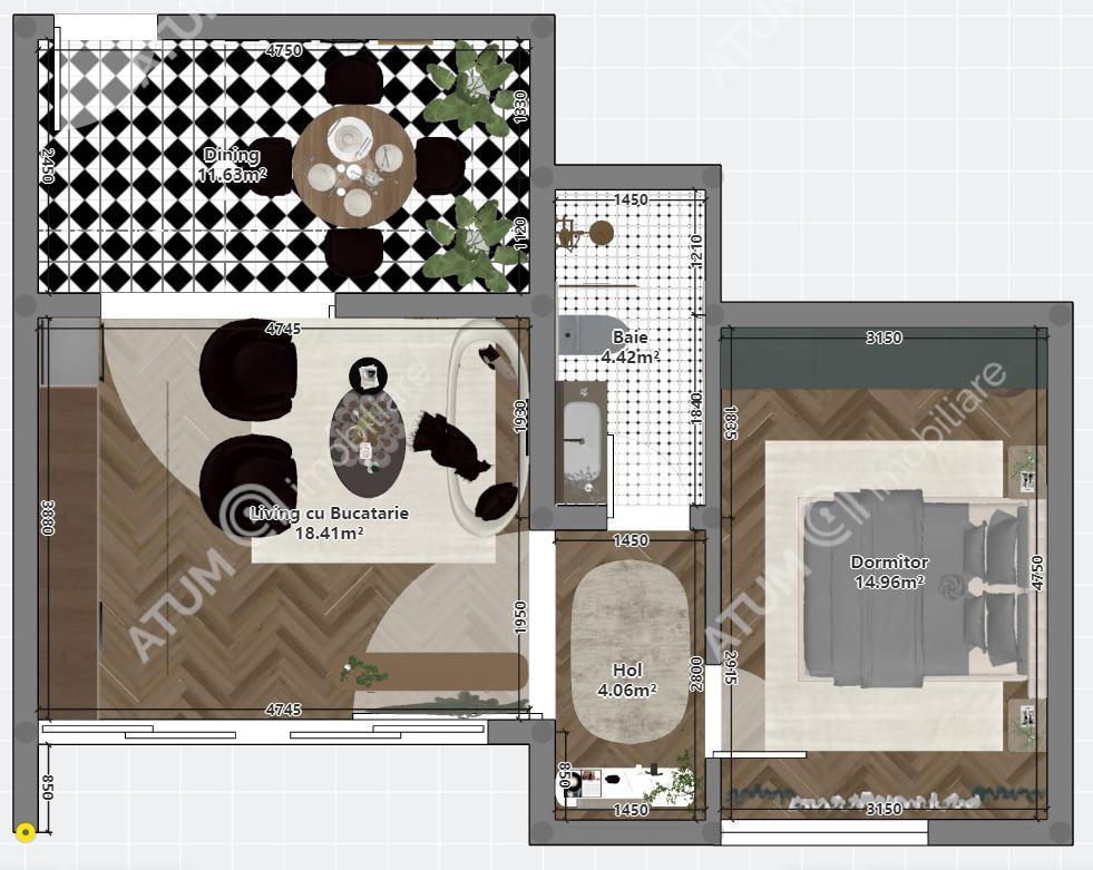 Interior practic: zonă de zi open-space 31,2 mp (living + bucătărie), dormitor generos 15 mp, baie 4,1 mp și balcon închis accesibil din living.