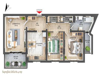 Locuinta are 83 mp utili si este compusa din living, bucatarie separata si inchisa, 2 dormitoare, baie ce dispune de geam pentru aerisire, wc servici, debara si un hol spatios cu spatiu pentru pantofar si cuier. Separat de suparafata utila apartamentul dispune de 2 balcoane.
