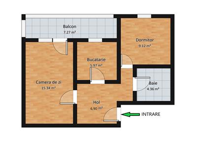 Locuinta dispune de o compartimentare decomanda, acesta fiind compus la intrare dintr-un hol generos unde poate fi amenajata zona de primire cu pantofar si cuier dar poate fi pozitionat si un dressing, camera de zi unde poate fi amenajat si un dinning, dormitorul, bucataria separata si baia dotata cu cada, toate acestea insumand 44 mp utili.