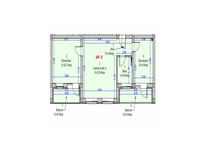 Separat de suprafata utila apartamentul dispune si de 2 balcoane, unul cu suprafata de 4,20 mp in care accesul se face din dormitor iar al doilea de 5.00 mp cu acces din bucatarie