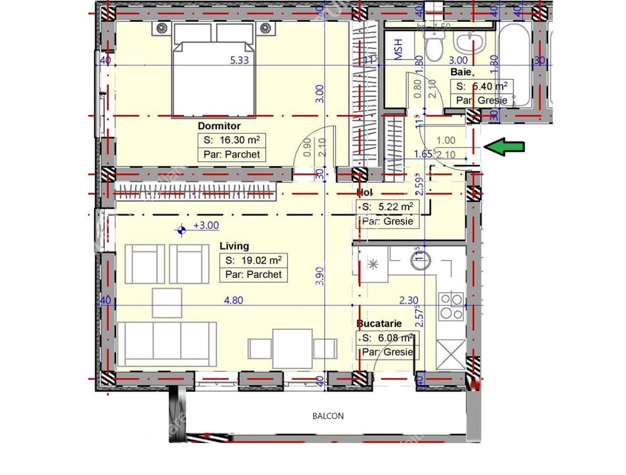Separat de suprafata utila apartamentul beneficiaza si de un balcon generos de 7 mp.