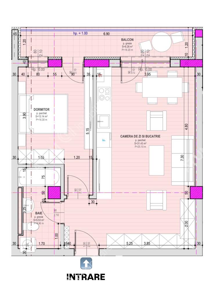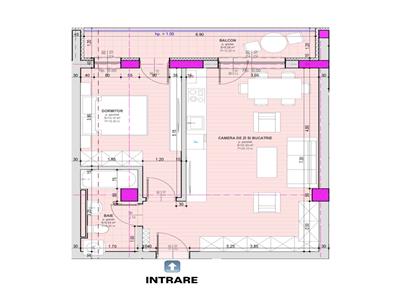 Apartamentul are o suprafata utila de 50,10 mp si este compartimentat eficient: living generos deschis cu bucataria in suprafata de 31,43 mp, dormitor de 13,14 mp, baie de 5,53 mp.