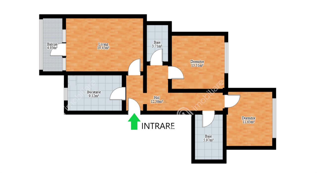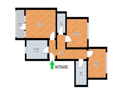 Suprafata totala este de 97 mp si este compartimentat astfel: living spatios cu zona de luat masa 21 mp, bucatarie inchisa 9.6 mp, doua dormitoare mari cu pat matrimonial cca 13 mp fiecare, o baie cu cada 6 mp, o a doua baie de 4 mp dotata cu cabina de dus walk-in, hol generos la intrare si un balcon deschis.