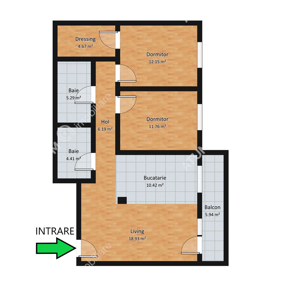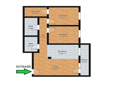 Locuinta are suprafata de 74 mp utili si este compusa din living in suprafata de 19 mp, dormitorele de 12 mp, bucataria deschis cu locul de luat masa 10.42 mp, holul cu spatiu pentru pantofar si cuier, baile de 5.29 mp respectiv 4.41 mp si dressing de 4.67mp.