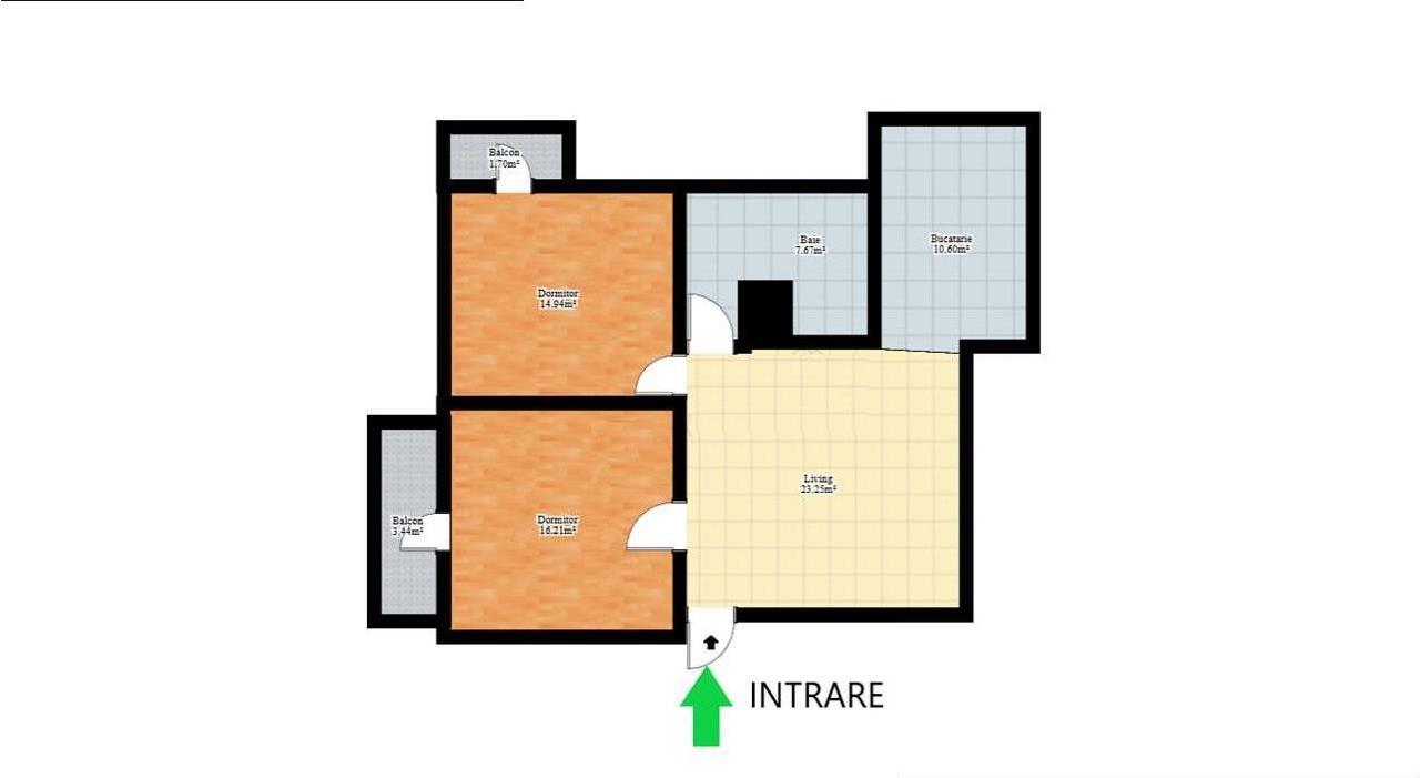 Compartimentarea apartamentului este dispusa astfel: living cu bucataria de tip open-space, 2 dormitoare si baie, acestea insumand 65 mp. Separat de suprafata utila mai detine 2 balcoane inchise in suprafete de 2 mp, respectiv 3 mp.