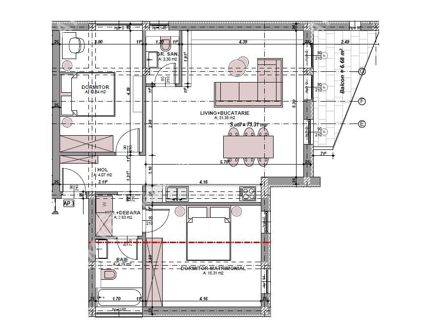 Apartamentul are suprafata utila de 73.31 mp, acesta fiind compus din camera de zi tip open space cu bucataria 31.35 mp, 2 dormitoare dintre care cel matrimonial de 15,31 cu acces la propria baie de 4.19 mp dotata cu geam iar dormitorul secundar de 12,54 mp, acesta poate fii amenajat ca si un birou/ camera copilului sau dormitor pentru oaspeti, baia de 2.33 mp dotata cu geam pentru aerisire si cada si un hol de 4,07 mp unde poate fi amenajata zona de primire cu pantofar si cuier.