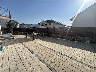 Gradina de 165 mp este imprejmuita cu gard realizat pe fundatie din beton iar inchiderea realizata din lemn si piatra. Aceasta dispune de doua cai de acces, una auto prin intermediul portii automatizate direct spre carport sau pietonala. Gradina este integral pavata cu dale din beton si dispune de o zona decorativa unde sunt plantati arbusti decorativi, dispune de iluminare perimetrala cu lampi solare iar in spatele carportului se mai afla si 3 boxe metalice destinate depozitarii.