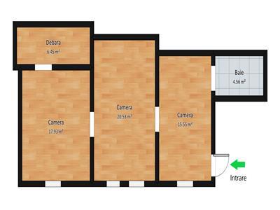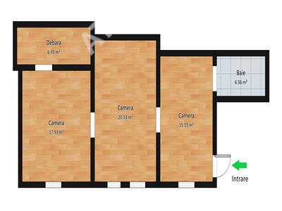 Intrarea se face prin bucataria de 15,50 mp dotata cu centrala termica din care se face accesul si spre baia de 4,32 mp dar si spre cele 2 camere. Prima camera este pretabila pentru spatiu de living cu suprafata de 19,80 mp, dotata cu 2 ferestre mari ce asigura flux de lumina natural, iar ultima camera de 16 mp este pretabila pentru dormitor, fiind dotata cu un geam generos si cu spatiu pentru dressing de 6 mp.