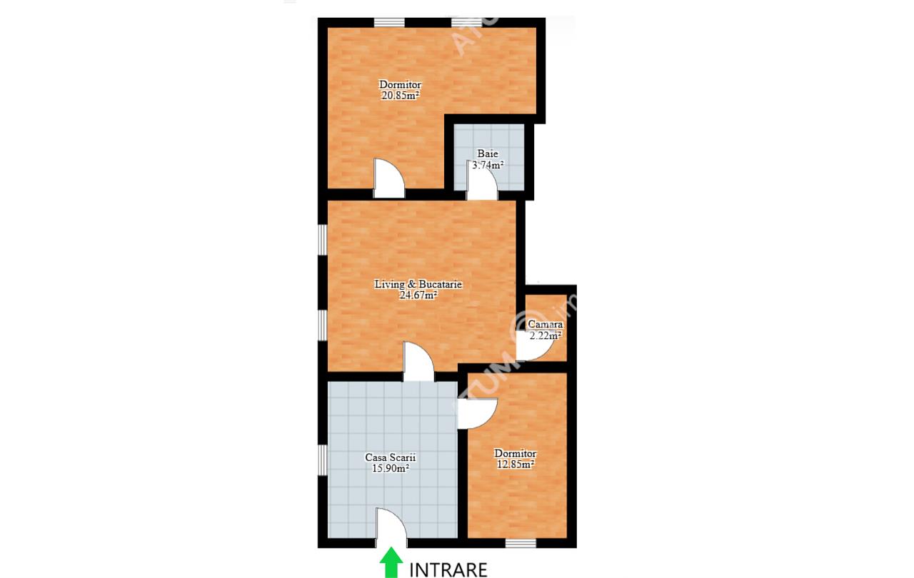 Locuinta este compusa din living open-space cu bucataria, doua dormitoare, camara, grup sanitar, toate acestea insumand 84 mp utili. Apartamentul se vinde complet mobilat si echipat cu aragaz, frigider, masina de spalat rufe, hota, TV, etc.