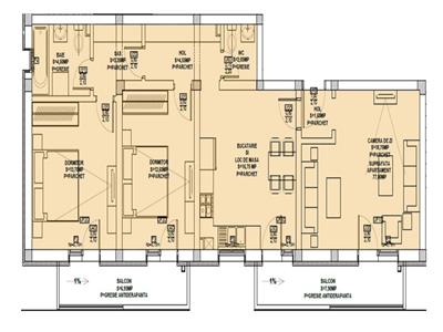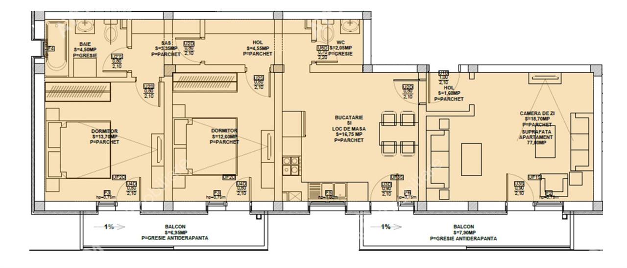 Separat de suprafata utila a apartamentului acesta dispune si de 2 balcoane, unul de 7.90 mp in care accesul se face din camera de zi si bucatarie si un altul de 6,95 in care se face accesul din dormitoare.