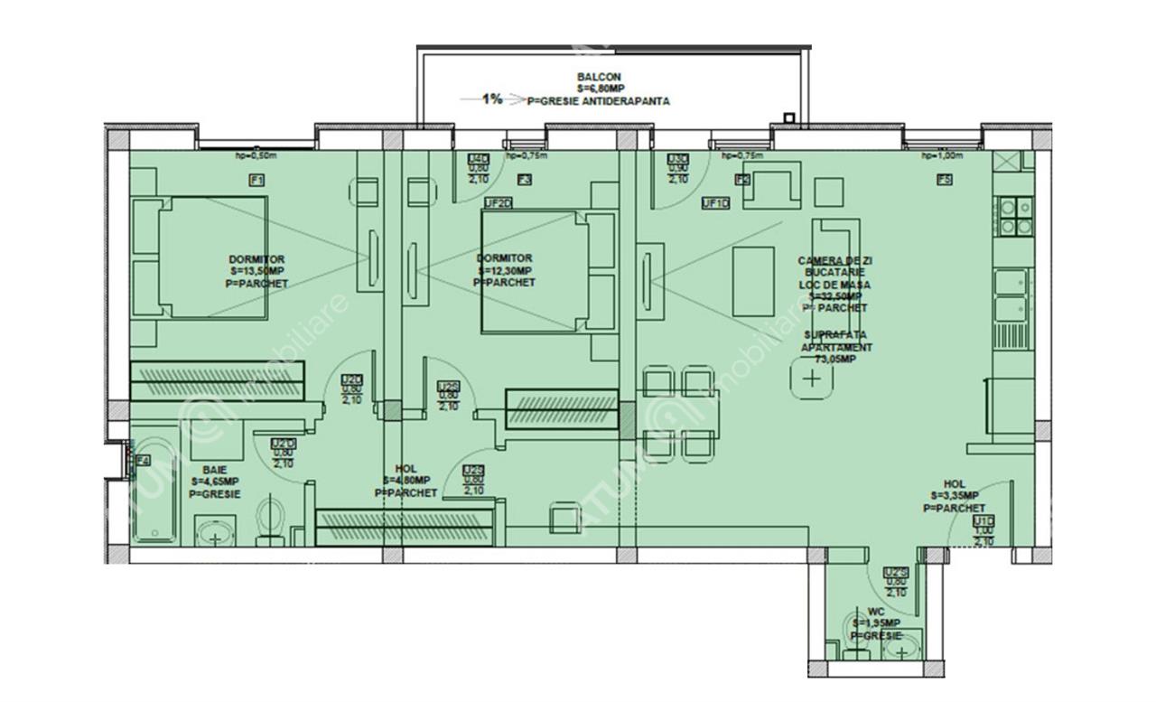 Apartamentul are 94,46 mp construiti si 73,05 mp utili, acesta fiind compus dintr-un living open space cu bucataria de 32,50 mp, doua dormitoare dintre care cel matrimonial de 13,50 mp iar cel secundar 12,30 mp, 2 bai iar cea principala 4,65 mp dotata cu geam de aerisire si cada iar cea de serviciu 1,95 mp, hol de acces 3,35 mp unde poate fi pozitionat cuierul cu pantofar iar al doilea hol 4,80 mp unde poate fi incastrat un dressing spatios.