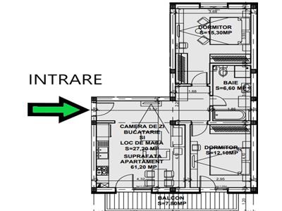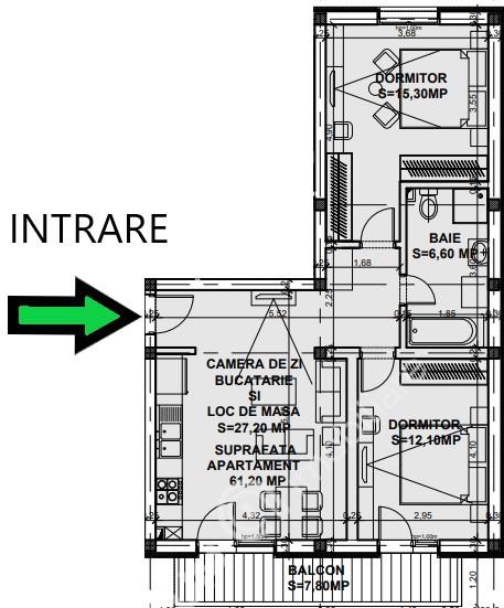 Apartamentul are suprafata utila de 61.20 mp, distribuita pe living cu bucatarie de 27.20 mp, 2 dormitoare de 13.50 mp, respectiv 12.10 mp, baie de 6.60 mp si hol de acces unde se poate amenaja cuier si pantofar.
