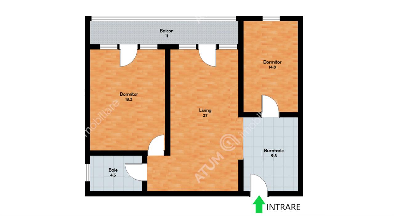 Apartamentul are suprafata utila de 69 mp dispus astfel: living de 27 mp, bucatarie 9.8 mp, dormitor 14.8, al doilea dormitor de 13.2, baie de 4.5 mp. Separat de suprafata utila mai beneficiaza de un balcon deschis de 11 mp si pivnita de 2 mp.