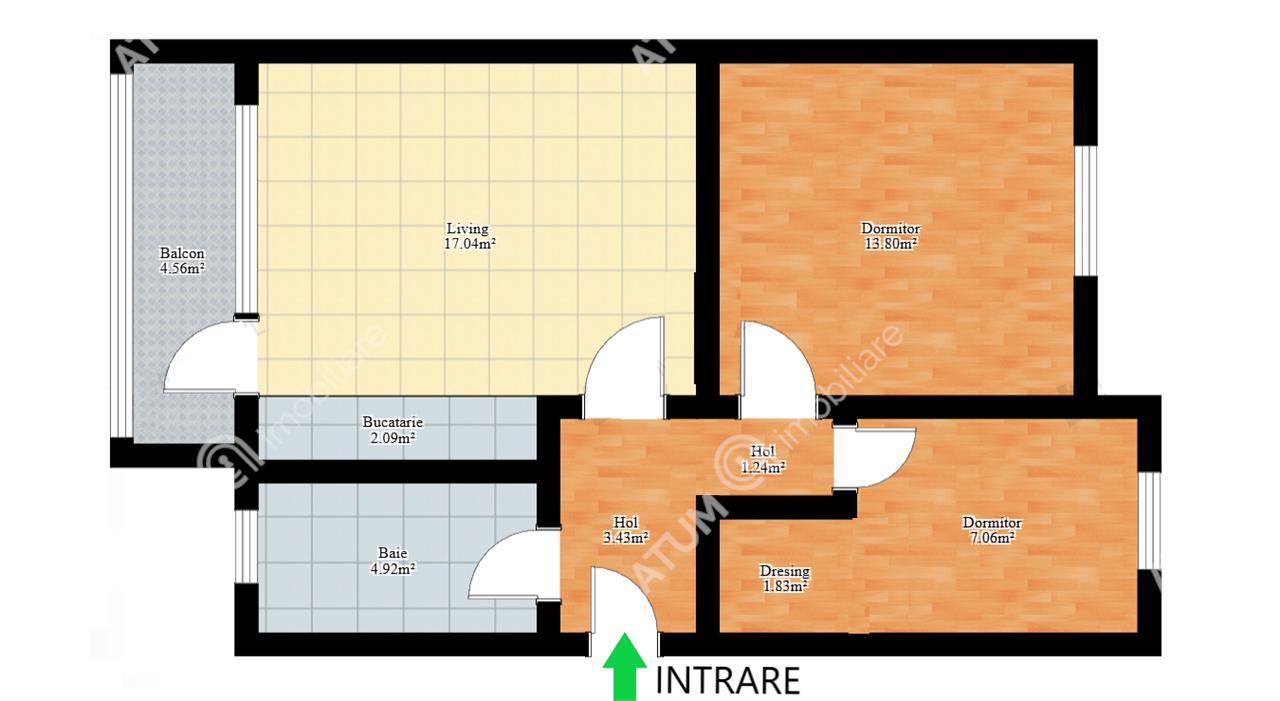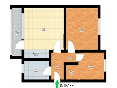 La intrare in apartament se afla un hol dotat cu cuier si pantofar, din care se face accesul in living/bucatarie, dormitoare, baie; acestea insumand 50 mp utili.