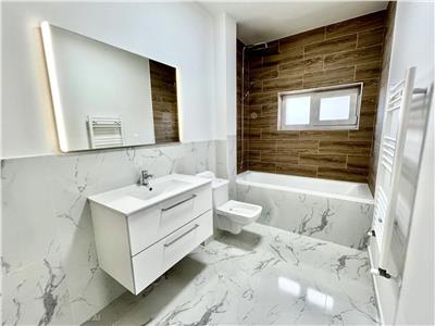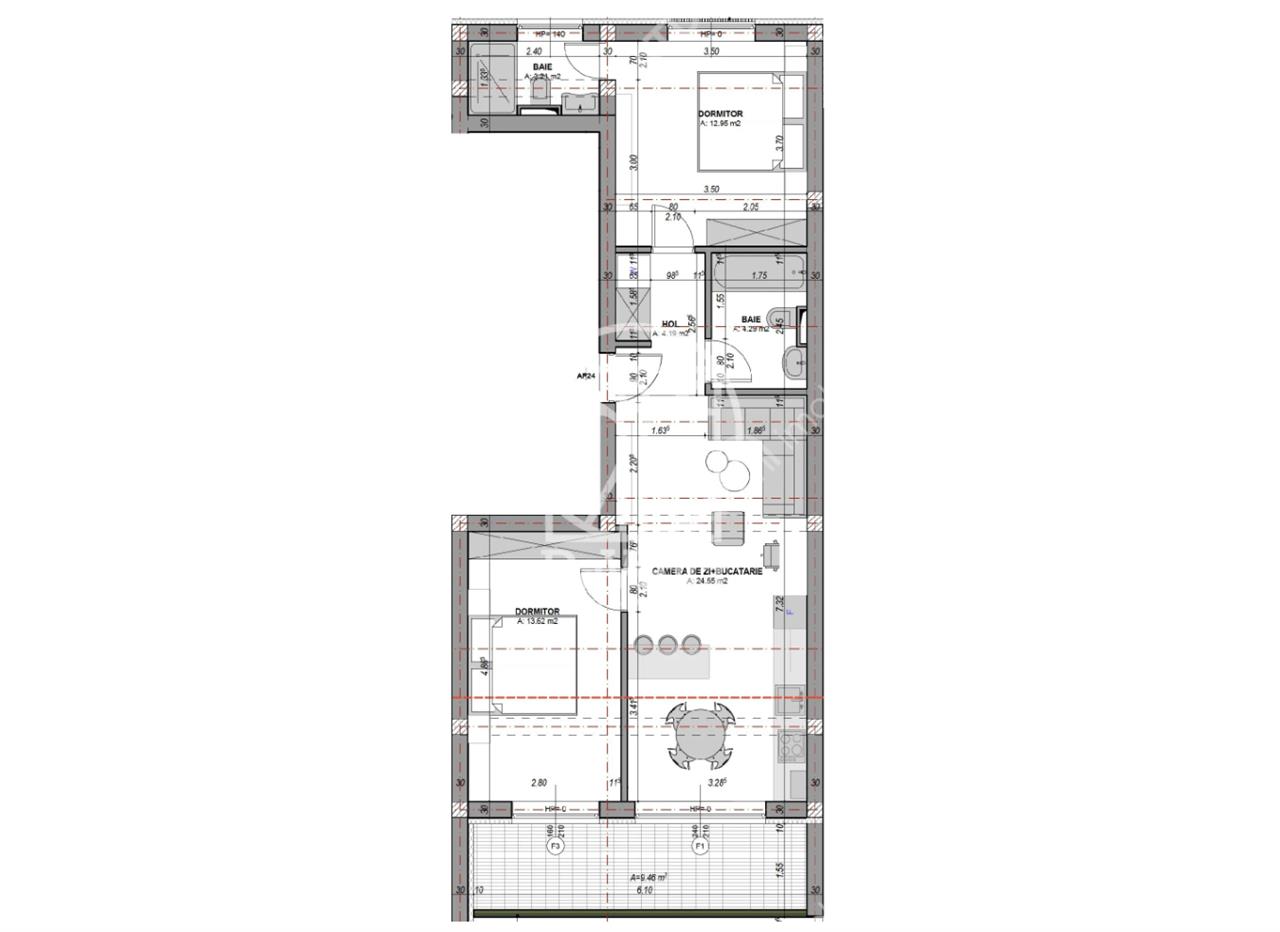 La intrare in apartament regasim un hol de 4 mp, un dormitor matrimonial de 13 mp cu baie proprie de 3 mp, living open space cu bucataria 25 mp, a doua baie de 4 mp, dormitor de 13.5 mp. Separat de suprafata utila ma detine o terasa de 9 mp.