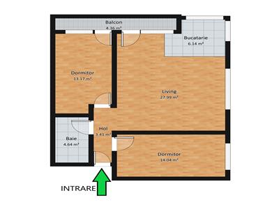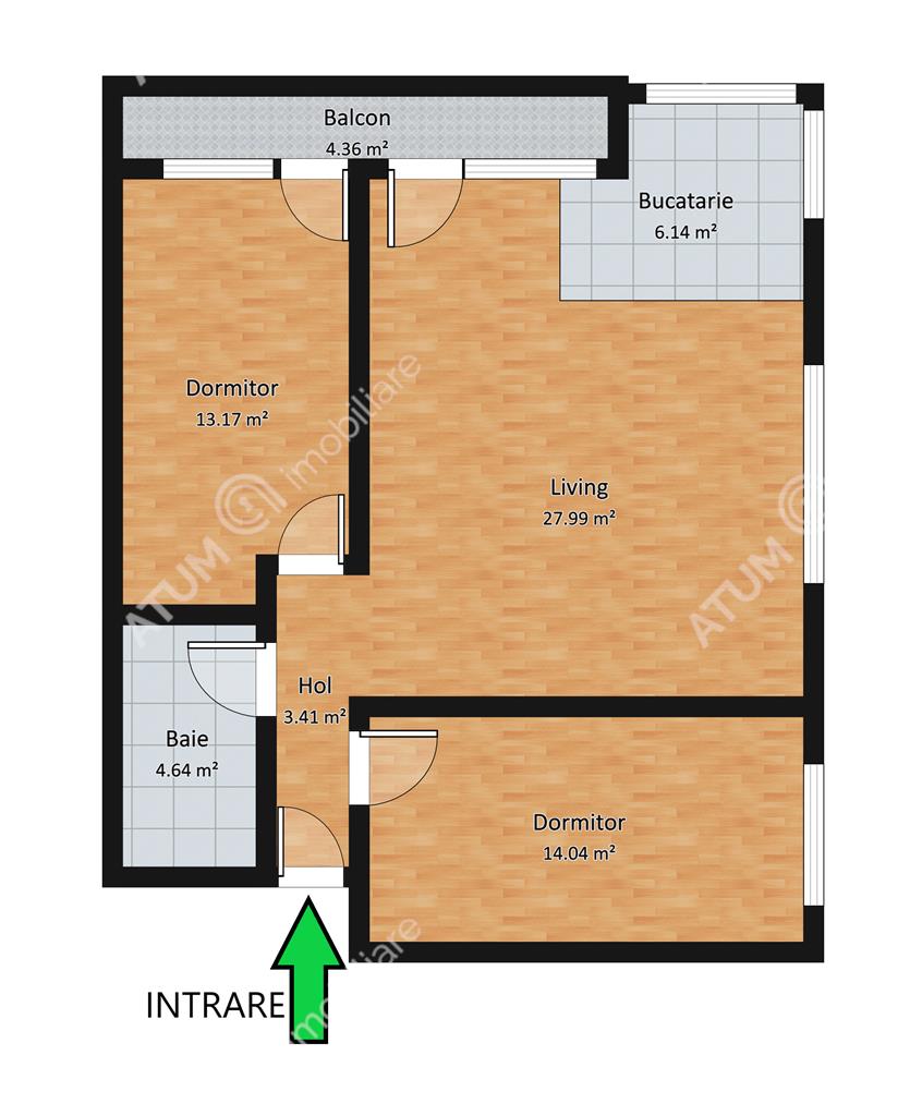 Apartamentul are suprafata utila de 70 mp, distribuita pe living cu bucatarie de 34 mp, 2 dormitoare de 13.47 mp, respectiv 13.90 mp, baie de 4.56 mp si hol de acces unde se poate amenaja cuier si pantofar de 4 mp.