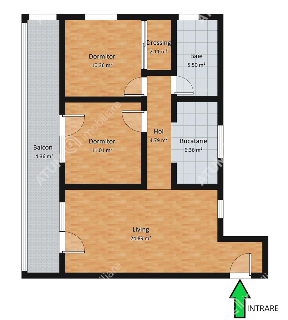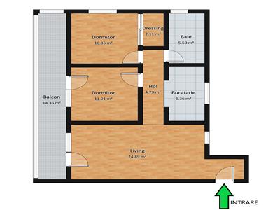 Suprafata utila este de 69 mp dispusi decomandat in 2 dormitoare spatioase, living generos, bucatarie, baie si baie de serviciu daca se doreste amenajarea acesteia, un hol de intrare cu spatiu de pantofar si cuier plus un al doilea hol din care se face accesul in camere. Separat de suprafata utila, apartamentul dispune de un balcon foarte spatios in care accesul se face atat din camera de zi cat si din dormitor.