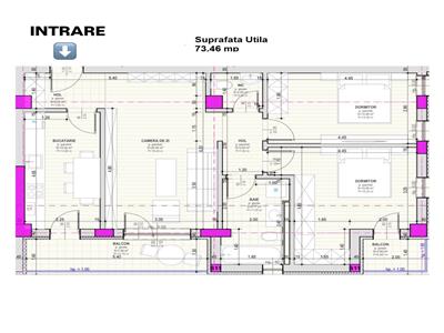 Apartamentul dispune de o suprafata utila de 73,46 mp si este compartimentat eficient in camera de zi de 20,40 mp, doua dormitoare, dintre care dormitorul matrimonial de 15,05 mp permite amenajarea unui dressing generos, iar cel de-al doilea dormitor de 12,46 mp este potrivit pentru copii sau oaspeti, bucatarie separata, doua bai dintre care baia principala de 6,77 mp este prevazuta cu geam pentru aerisire si cada, iar cea secundara de 2,00 mp, precum si un hol de acces de 3,36 mp cu spatiu dedicat pentru pantofar si cuier. In completarea suprafetei utile, locuinta beneficiaza de doua balcoane, unul generos de 7,56 mp cu acces din living si bucatarie, ideal pentru relaxare, si un al doilea balcon de 2,80 mp cu acces din dormitorul matrimonial.