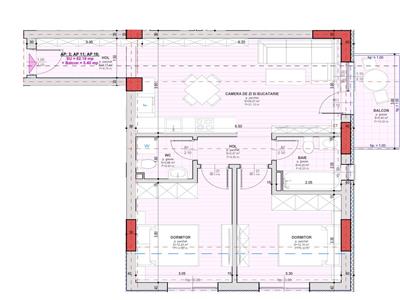 Apartamentul are o suprafata utila de 62,18 mp si este compus dintr-o camera de zi cu bucatarie open space de 24,00 mp, doua dormitoare de aproximativ 12 mp fiecare, o baie de 4,20 mp dotata cu cada si geam pentru aerisire naturala, o toaleta de serviciu si un hol generos cu spatiu pentru cuier si pantofar.