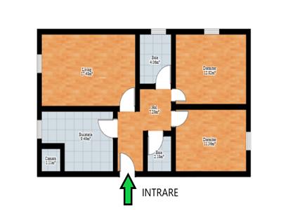Locuinta are suprafata utila de 65 de mp si este compusa din hol acces de 3,70 mp, bucatarie de 11 mp dotata cu camara de 1 mp, living de 18 mp, hol intermediar 2 mp, 2 bai, una de 4,30 mp dotata cu geam de aerisire si o alta de 2,30 mp si 2 dormitoare de 12 mp, respectiv 11,50 mp. Separat de suprafata utila, apartamentul dispune de o pivnita de 11 mp.