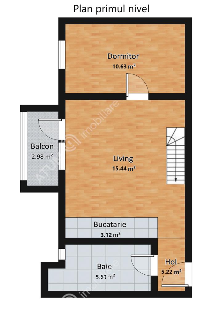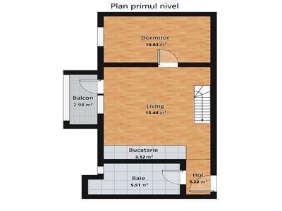 Locuinta are surpafata utia de 78 mp, distribuita pe 2 nivele. Primul nivel detine 43 mp compusi din hol de acces, living cu bucatarie de tip open space, dormitor, baie si balcon de tip loggie inchis in tamplarie PVC cu geam termopan unde este amenajata zona de gatit. Din zona de living se face accesul la nivelul superior cu ajutorul unei scari din lemn masiv, unde se afla 2 dormitoare si un hol, acestea insumand 35 mp.