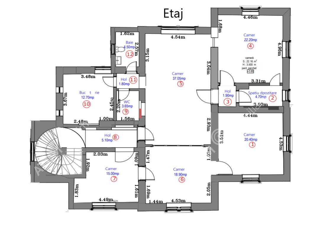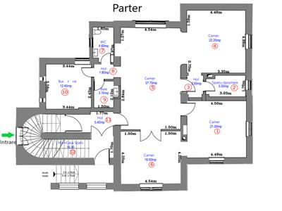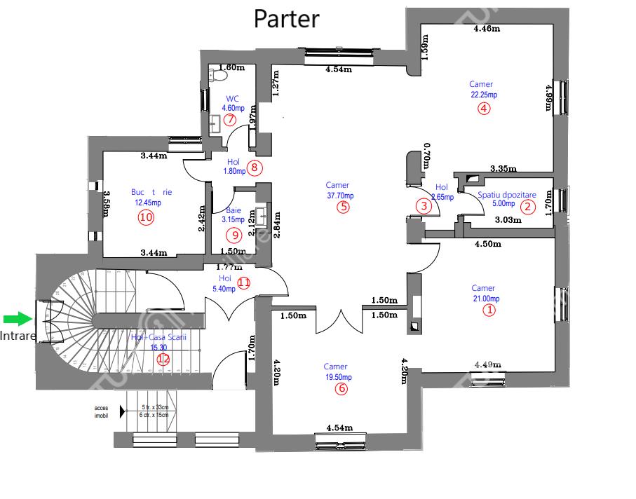 PARTERUL deține o compartimentare circulara si găzduiește 4 camere, una foarte generoasa de 37.70 mp, 19.50 mp, 21 mp, 22,25 mp, o bucatarie de 12.45 mp, 3 holuri de 5.4 mp, 1.8 mp, 2.65 mp, spatiu de depozitare de 5 mp si casa scarilor de 15.3 mp. De aici ne rezulta o suprafață utila totala de 150.8 mp