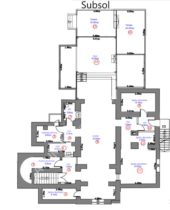 La demisol vom regăsi o camera generoasa de 52.65 mp, 5 spatii de depozitare de 9.25 mp, 6.15 mp, 23.25 mp, 4.25 mp, 10.7 mp, 2 grupuri sanitare de 3.8 mp respectiv 4.55 mp, 4 holuri de 3.15 mp, 7.55 mp, 3.8 mp, 3.6 mp, o camera tehnica de 6.65 mp si o sera/terasa de 65,20 mp. Suprafață utila totala fiind de 204.55 mp.