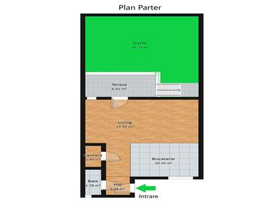 La parter se afla holul de acces, prevazut cu cuier, un wc de servici cu geam si cabina de dus, precum si o camara utila pentru depozitare. Tot la acest nivel se regaseste livingul generos cu bucatarie open-space. Din living se face accesul direct pe terasa, iar mai departe in curtea proprie de aproximativ 40 mp, un spatiu ideal pentru relaxare, gratar sau activitati in aer liber, oferind intimitate si confort.