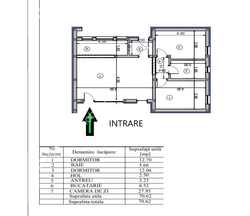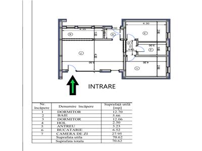 Locuinta are suprafata de 71 mp si este compusa din 2 dormitoare de 12,70 respectiv 12,06 mp, living cu bucatarie tip open space de 34,47 mp, baie de 5,66 mp, antreu de 3,23 mp si hol de 2,50 mp.
