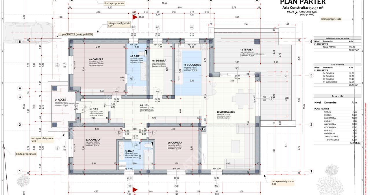 Locuinta este distribuita pe Parter+Pod si insumeaza 130 mp utili, aceasta fiind compusa din: living de 32.5 mp, bucatarie aprox. 12 mp, camera tehnica de 7.7 mp, dormitor matrimonial de 17 mp cu baie proprie de 6 mp, hol de 22 mp, dormitor de 12.7 mp, baie 6.5 mp si al treilea dormitor de 12.7 mp. Separat de suprafata utila mai detine o terasa de 29 mp.