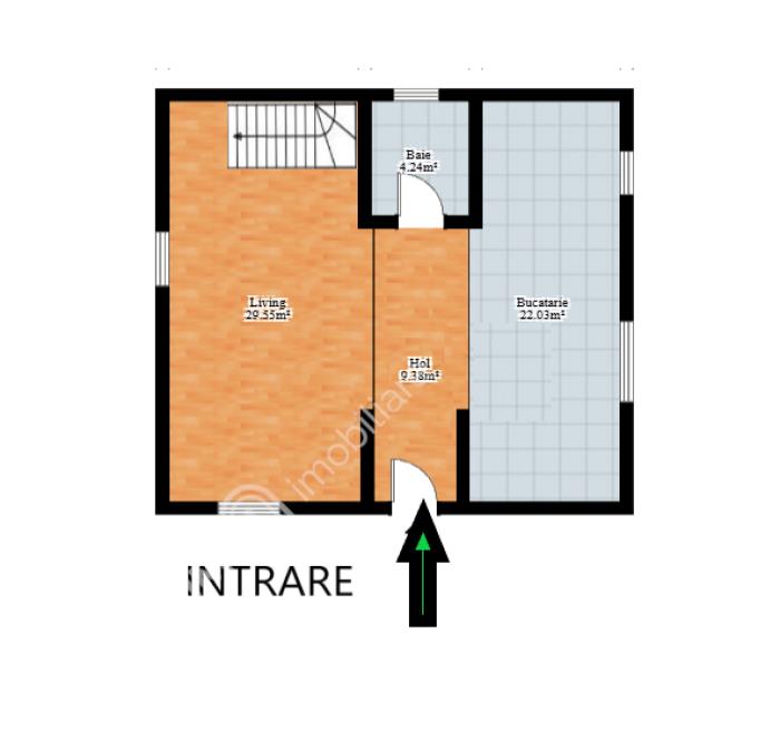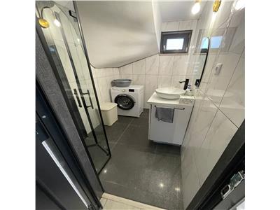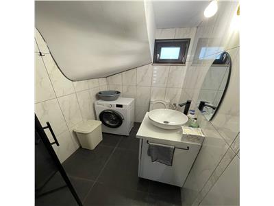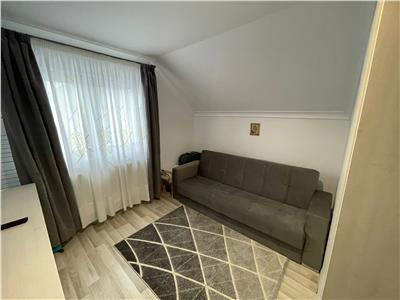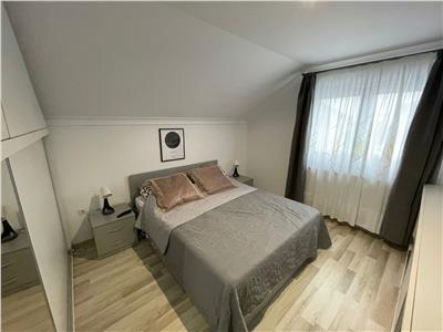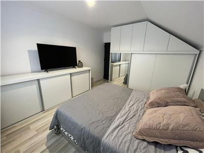 Locuinta are suprafata de 100 mp si este dispusa pe 2 nivele, dupa cum urmeaza: la parter se afla un living spatios complet mobilat, cu suprafata de 42 mp, o baie dotata cu cabina de dus si geam de aerisire si bucataria complet mobilata si utilata cu electrocasnice de calitate. La etajul superior, suprafata de 49 mp este compusa din 3 dormitoare decomandate cu suprafatelew de 15 mp cu acces spre balconul de 2 mp, respectiv 12 mp si 11 mp, o baie de 6 mp dotata cu cada si geam de aerisire si hol de acces 5 mp.