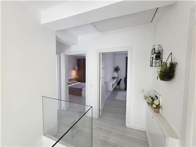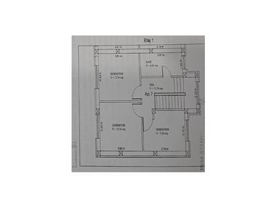 La etaj, accesul catre celelalte camere se face din holul de 10 mp, doua dormitoare matrimoniale de 12.3 mp, un dormitor de 9.5 mp si baia de 6 mp.
