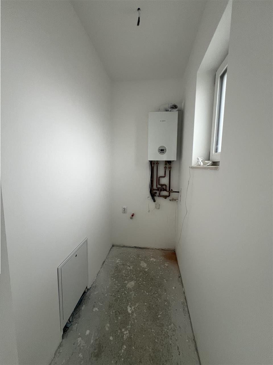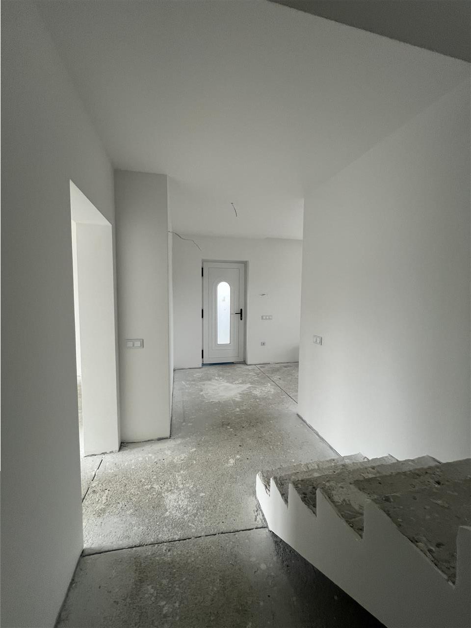 Casa se preda la stadiul de alb avansat si consta in dotari si finisaje precum: centrala termica marca Bosch in condesatie si intalzire in pardoseala atat la Parter cat si la Etaj cu distribuitoare separate pentru fiecare nivel iar ca si plus de confort incalzirea poate pe fiecare incapere separata poate fi realizata cu usurinta fiind deja cablajul pe pozitie, tamplarie PVC cu geam termopan 7 camere si 3 foi de sticla LOW-E iar ruperea termica este realizata la toate geamurile si usi, atat instalatia electrica cat si cea termica realizate din cupru, usa de acces din PVC izolatore termic si fonic, pereti tencuiti ( tencuiala var-ciment ), gletuiti si zugraviti in lavabila alba, instalatii electrice cu tablou general individual si sigurante pentru consumatorii de putere, prize si intrerupatoare montate marca Schneider din gama premium de sticla, instalatii pentru curenti slabi ( TV, Telefon, Internet ), scafe moderne realizate din gips-carton atat mentru ilumnat cat si pentru montarea sistemului retractabil electric pentru perdele si draperii.