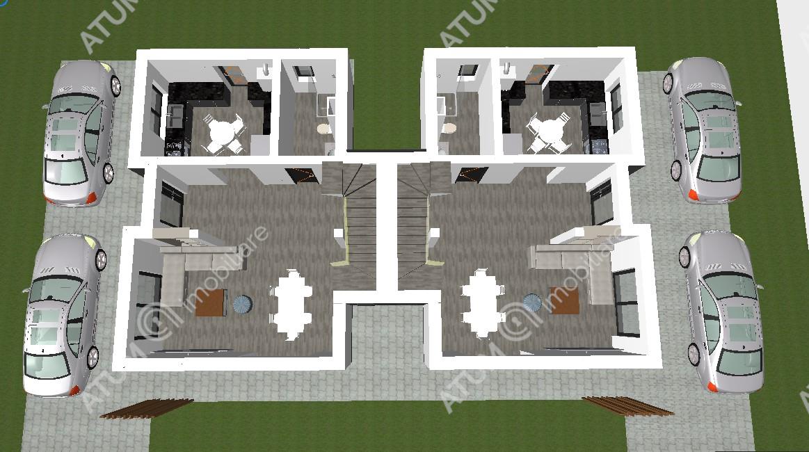 Pe terenul de 200 mp este pozitionata casa care are amprenta de 59 mp iar curtea libera de 141 mp este desfasurata pe cele 3 laturi ale casei. Casa este retrasa cu aproximativ 1,5 m de la limita de proprietate astfel creeanduse o zona decorativa cu flori si arbusti decorativi. In partea laterala este zona de parcare unde se pot parca 2 autotirisme iar in spatele casei, zona de relaxare unde poate fi amenajata o filigorie cu grill.