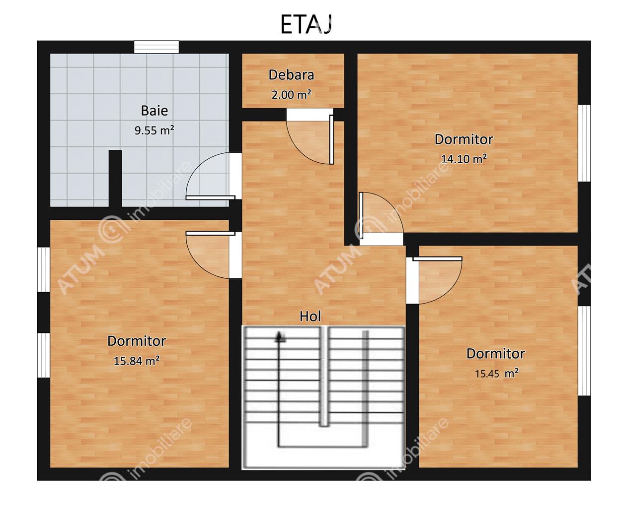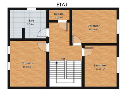 Casa are suprafata utila de 120 de mp si este impartita dupa cum urmeaza: la parter se afla un living spatios dotat cu semineu si o bucatarie tip open space insumand 41 mp cu posibilitatea de a fi separate si un wc de servici de 3,25 mp cu geam de aerisire, iar la etaj sunt amenajate 3 camere decomandate cu suprafete de 15,80 mp, 15,45 mp respectiv 14,10 mp, un spatiu de depozitare de 2 mp si o baie de 8,80 mp dotata cu cada si 2 geamuri de aerisire. Separat de suprafata utila beneficiaza de o un pod pe toata suprafata casei cu posibilitatea de amenajare.