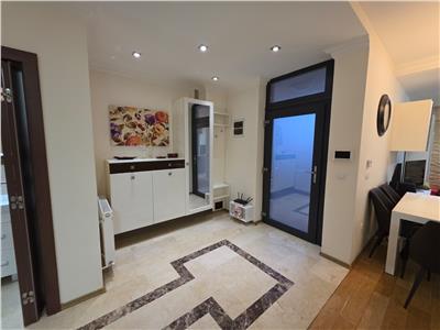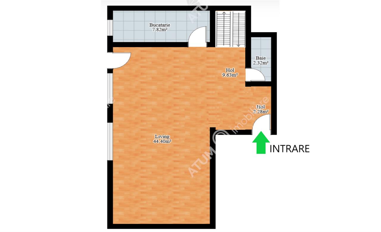 La parter gasim un hol generos la intrare dotat cu cuier si pantofar, living de 44 mp cu bucatarie deschisa, baie de serviciu 2.3 mp si separat o bucatarie inchisa de 7.8 mp.