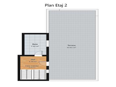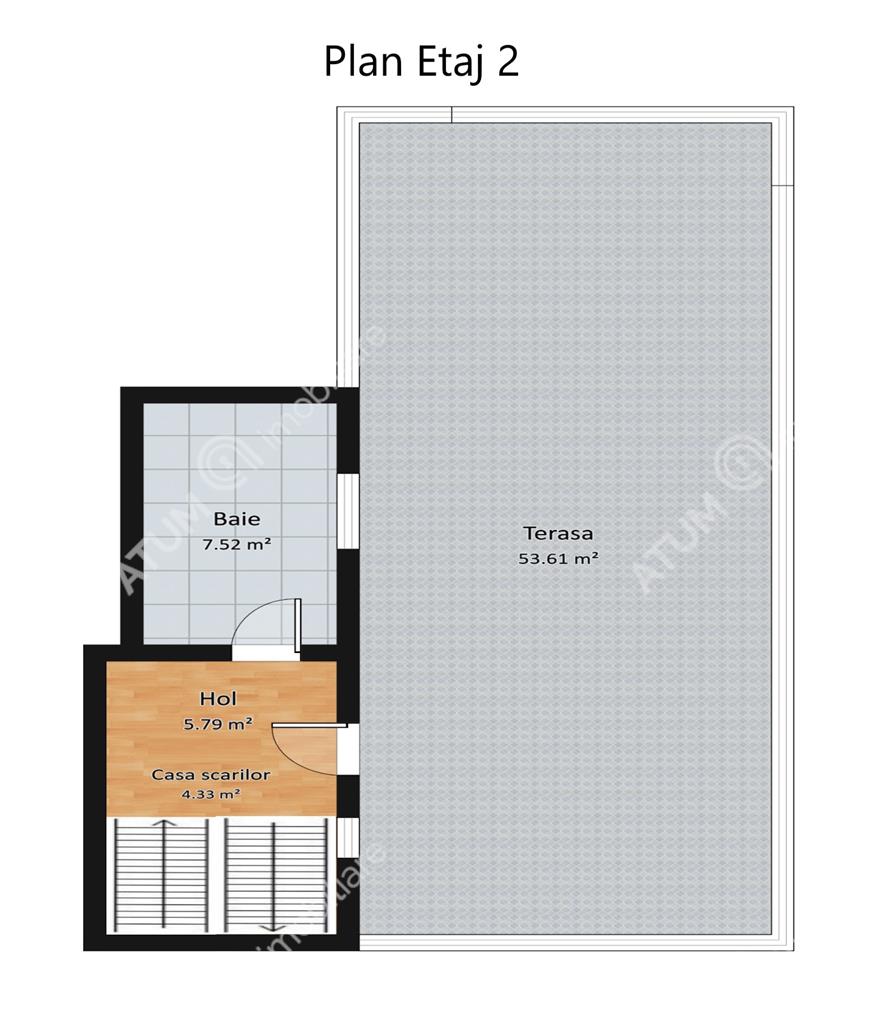 Al doilea etaj este compus din: hol de 4.3 mp, baie de 7.5 mp dotata cu geam de aerisire si cabina de dus multifunctionala si terasa deschisa de 50 mp.
