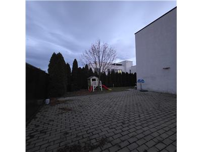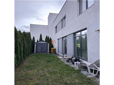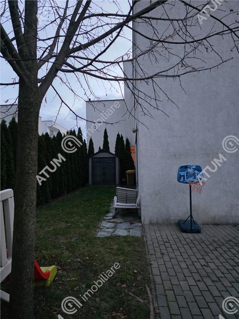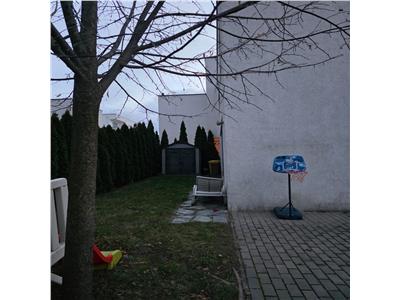 Curtea este amenajata cu alei pietonale pavate, zone verzi, prize exterioare si sursa de apa pentru udat gazonul, o magazie pentru depozitarea obiectelor de gradina si un spatiu dedicat relaxarii sau pregatirii gratarului.