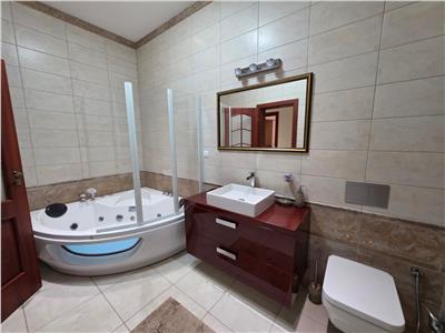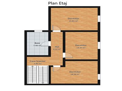 Primul etaj dispune de hol cu casa scarilor de 15 mp, un dormitor matrimonial de 15.8 mp, 2 dormitoare de 13, respectiv 14.5 mp si o baie de 7.5 mp dotata cu cada de dus cu hidromasaj si geam de aerisire.