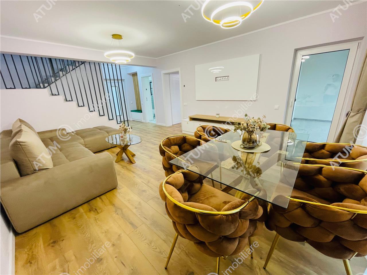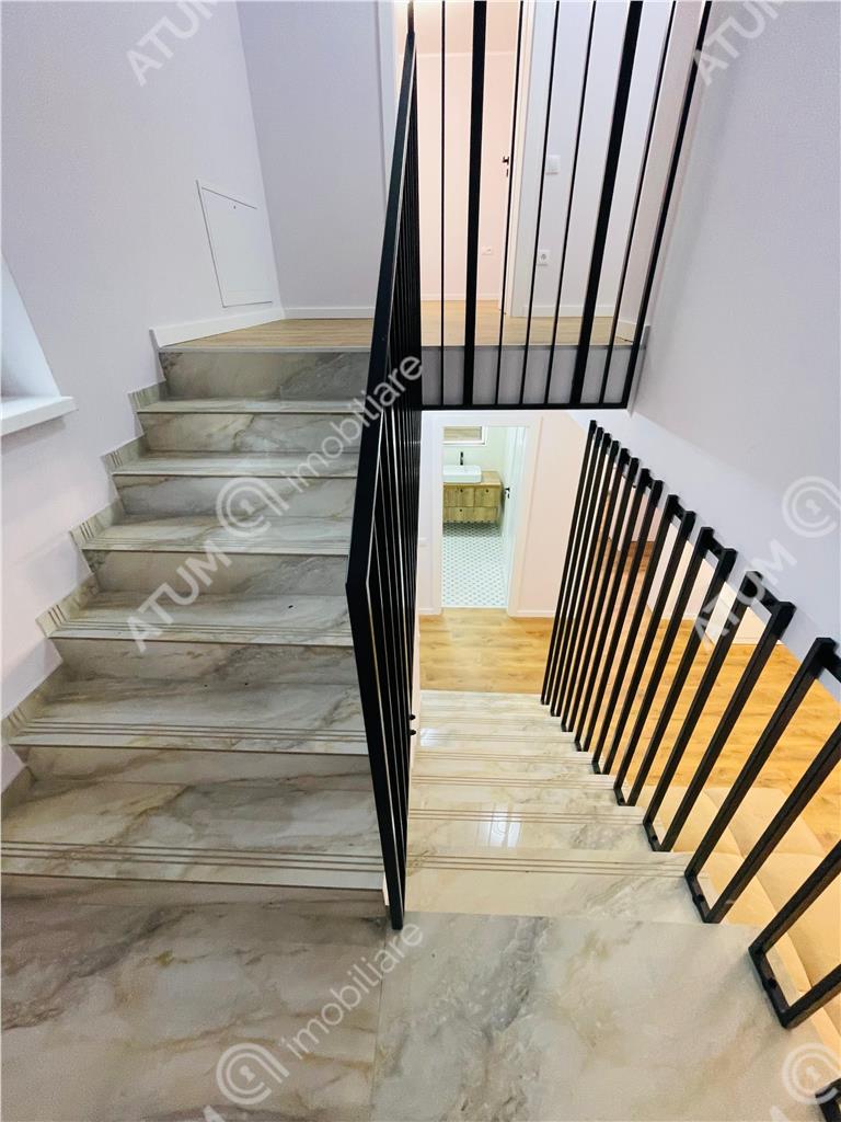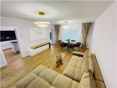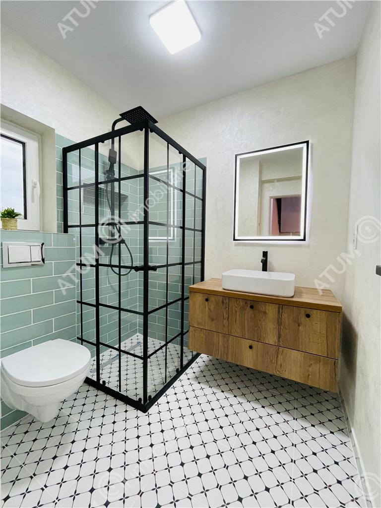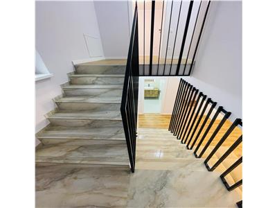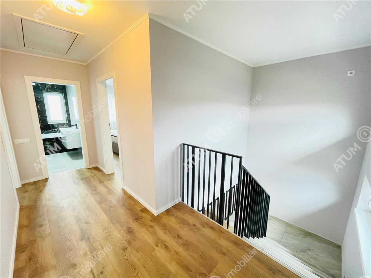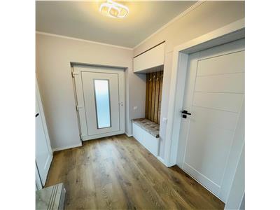 La interior, casa este finisata la standarde moderne, cu pereti tencuiti, gletuiti si zugraviti in lavabila, pardoseli din parchet SPC si gresie, bai complet echipate cu obiecte sanitare suspendate si mobilier realizat la comanda, precum si usi interioare din MDF si lemn marca Naturen. Instalatiile electrice sunt realizate pe cupru, cu tablou general si sigurante separate, prize si intrerupatoare Schneider Sedna, iar pentru confort sporit sunt prevazute instalatii pentru aer conditionat, rulouri exterioare electrice si curenti slabi.