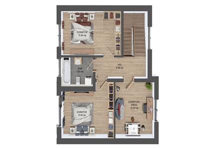 Etajul este dedicat zonei de odihna si include trei dormitoare bine proportionate, cu suprafete cuprinse intre aproximativ 12 si 16 mp, o baie cu cada si un hol central. De asemenea, este prevazut si un spatiu pentru spalator, asigurand un plus de functionalitate.